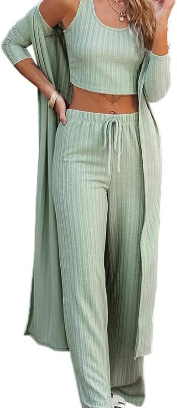 Womens 3 Piece Lounge Sets Pajamas Knit Long Sleeve Cardigan Crop Top Wide Leg Pants Loungewear Set